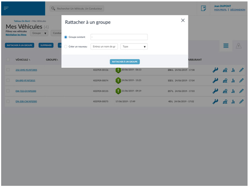 - Select the checkbox to the left of the vehicle name, then click the button[Rattacher à un groupe] at the top of the page, a window opens with the existing groups or the creation of a new one.