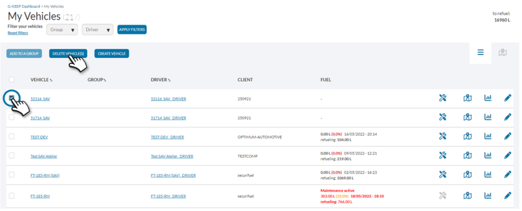 Deleting a vehicle is possible by selecting the checkbox to the left of the vehicle name, then clicking the delete button at the top of the page.