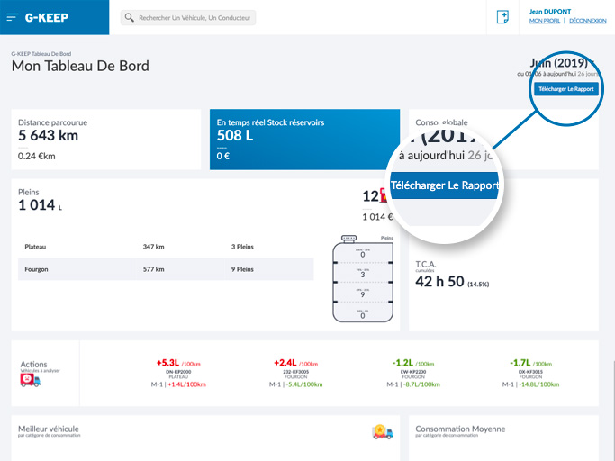 Pour télécharger le rapport individuel d’un véhicule, il suffit d’accéder à la page statistiques correspondante, de sélectionner la période d’export souhaitée puis enfin de cliquer en haut à droite de la page sur le bouton prévu à cet effet.