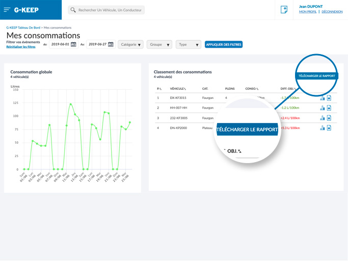 As for the fleet consumption reports, the consumption reports for a group can be downloaded by accessing the page[MES CONSOMMATIONS] , select the desired group and export period, then finally click on the button provided for this purpose at the top right of the page.