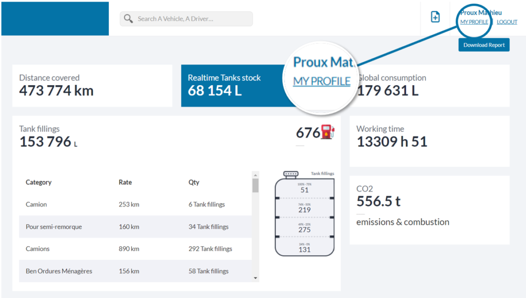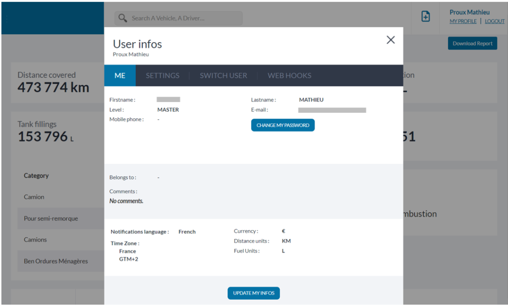 Access to profile information is from the link[MON PROFIL] available at the top right of the screen; when clicked, a window opens with two tabs, My Info & Settings.