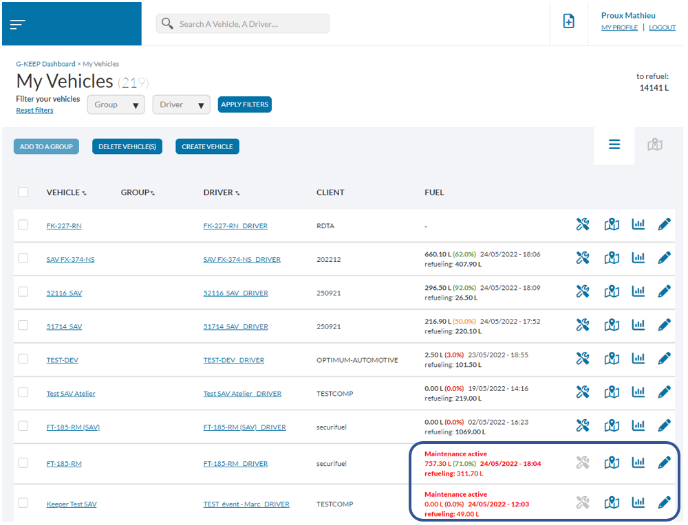 Se puede acceder al modo de mantenimiento según el rol del usuario ( ver roles y derechos del usuario). Se puede acceder y activar desde la lista de vehículos mediante el icono específico, cambiando de estado en función del estado: