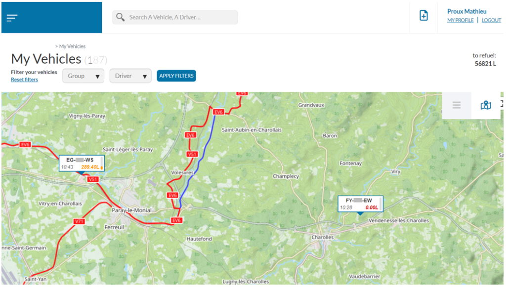 Todos os veículos visíveis de acordo com os direitos dos utilizadores estão disponíveis em duas vistas, sendo a primeira por padrão a vista da lista.